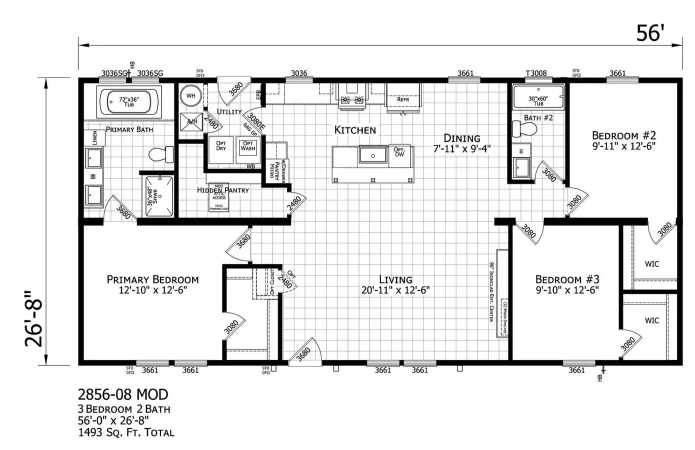 Champion’s IronClad Line combines energy efficiency, luxury upgrades, and an optional MOD package. This 1,493 sq. ft. double wide features a custom kitchen with island seating, farmhouse details, a spacious master suite, three designer color options, and an optional side porch.