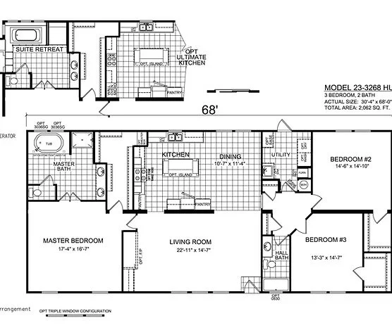 This spacious 2,062 sq. ft. double wide features a custom kitchen with optional island, an open living room with fireplace option, and a large utility room. The master suite includes a walk-in closet and deluxe bath with dual sinks, garden tub, and separate shower.