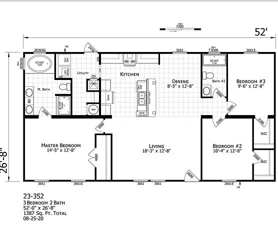 This 1,387 sq. ft. Champion modular home features an open kitchen with 4–5 seat bar, dining area overlooking the living room, and a spacious master suite with dual sinks, garden tub, and separate shower. Modular homes offer customizable options and are often viewed as comparable to traditional stick-built homes.